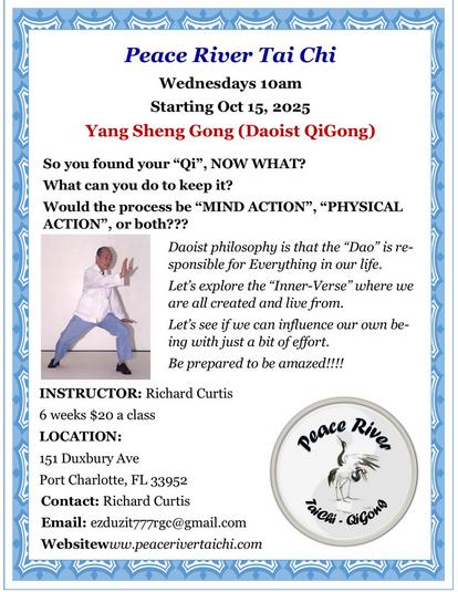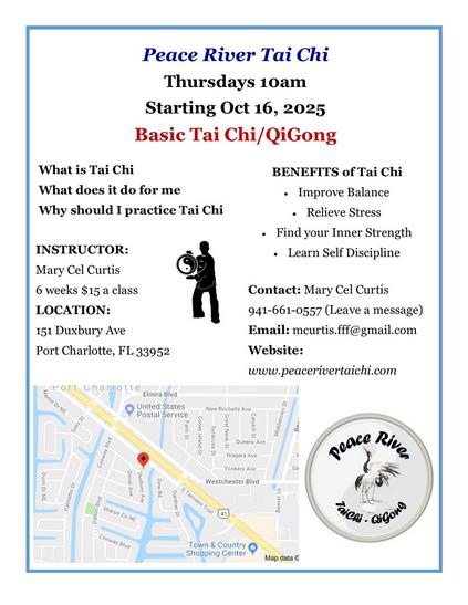We try to maintain a balance of taichi and qigong classes being taught in the Punta Gorda, North Port, and Port Charlotte area. The ideal condition is an ongoing taichi and qigong class on separate days. Class availability is normally a function of the number of persons desiring a particular form of taichi or qigong.